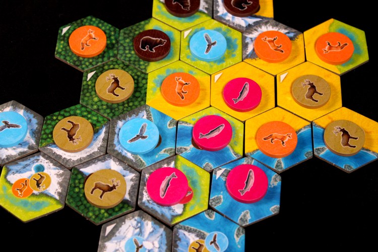 Cascadia invites players to explore the various biomes of the Pacific Northwest in a puzzley abstract strategy game of tile and token placement. Each game, new cards are revealed, dictating how animal tokens score relative to other animal tokens. The tiles, on the other hand, always score the same: the larger the habitat, the more points you score, with a bonus for players with the largest habitat of each type.