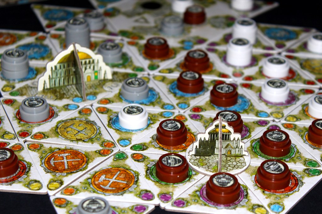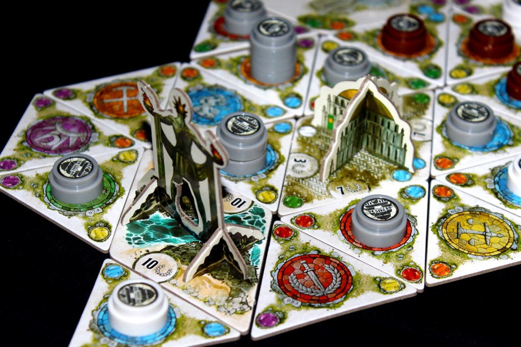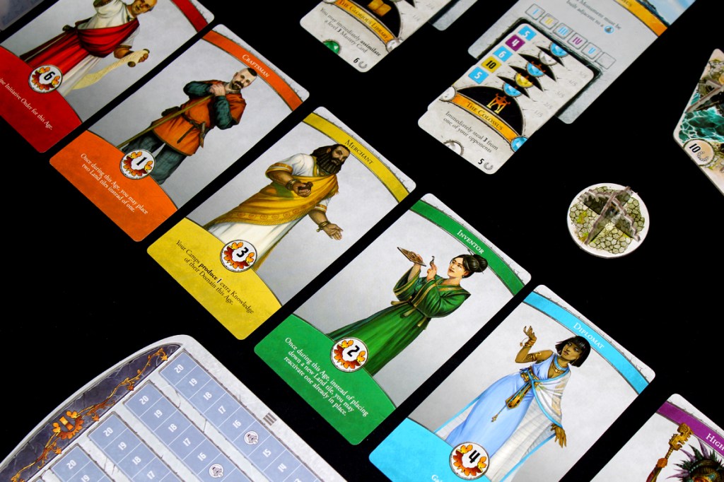 A solidly complex title, Dominations will easily take an hour or longer to play. To get anything done, you’ll need to place tiles and accrue Knowledge across six Domains. Once you have Knowledge, you can build Cities and Monuments or use that Knowledge to develop Mastery Cards. These various systems are the levers by which you propel your budding civilization to lasting greatness!
