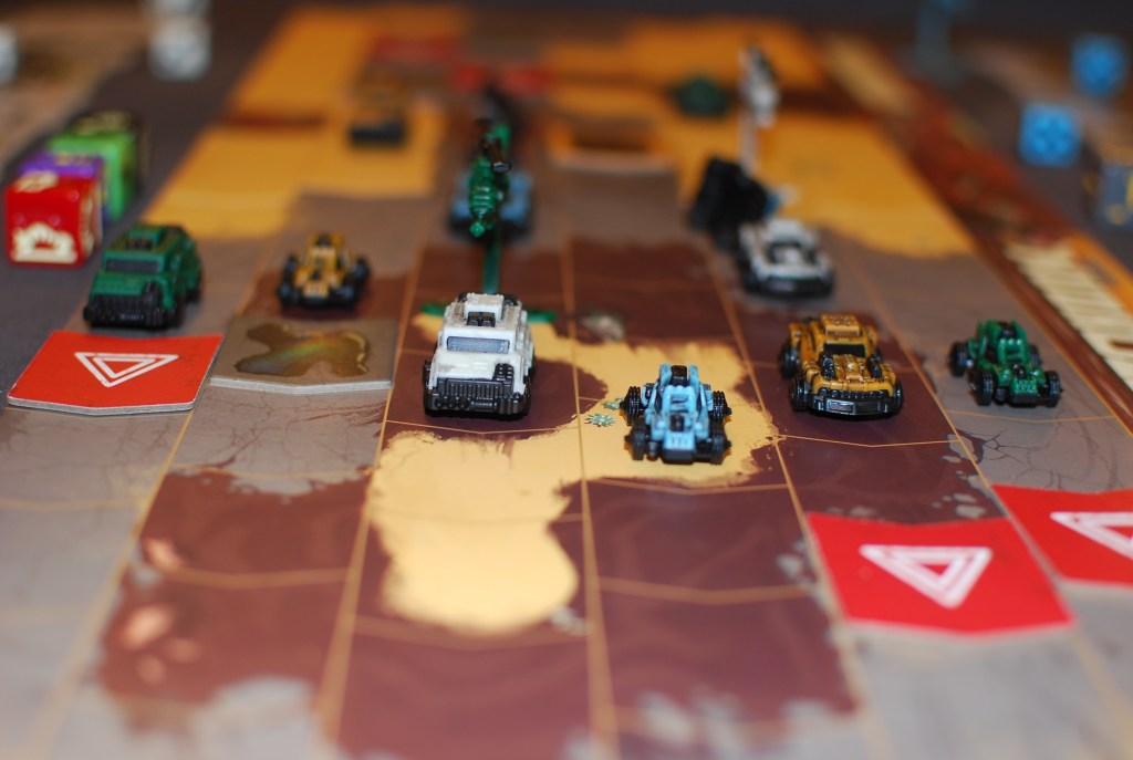 In Thunder Road: Vendetta, players race on an infinite road against the backdrop of a post-apocalyptic wasteland. As one does. With any race, though, there needs to be a winner, and while you might be able to out-drive your opponents, the guns mounted to their cars suggest that they may be less interested in fair play. Instead, you’ll have to dodge their tricks and throw a few of your own if you don’t want to end up buried below the rocks and rubble! Better for dice to roll than heads, after all.